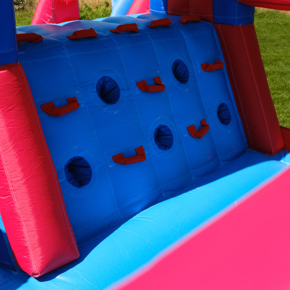 The Royal Wave Playground is built to last. We've redesigned the typical bounce house by upgrading materials where it matters most. While standard models use only 420D nylon throughout, ours feature 420D nylon for side walls and pillars, stronger 840D nylon for the bottom foundation, and durable 0.4mm PVC material in all jumping, climbing, and sliding zones. This targeted reinforcement of high-impact areas means our bounce houses withstand active play much longer than conventional all-nylon designs.