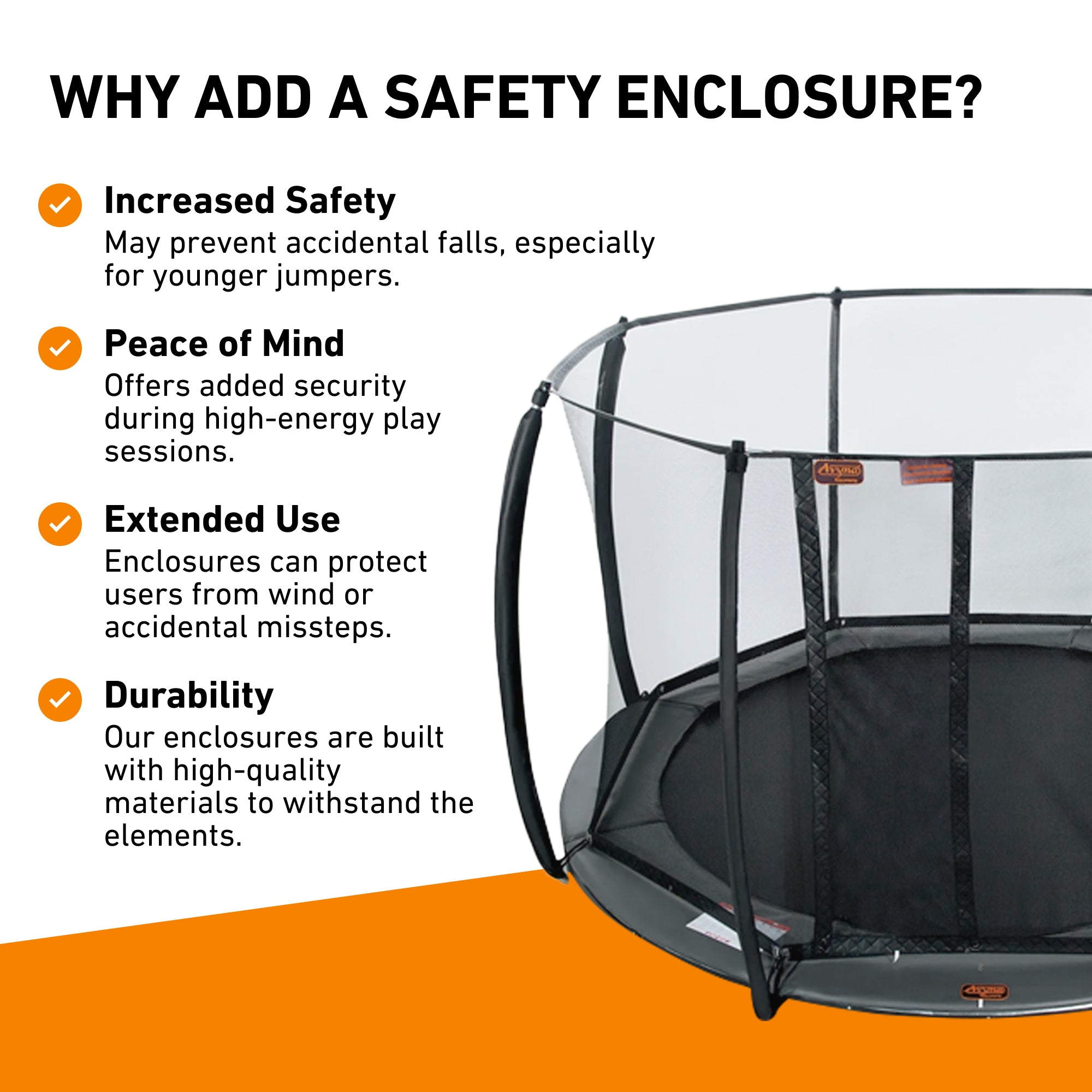 • Safety enclosures are recommended if objects are within 4 feet of the trampoline to prevent accidents.