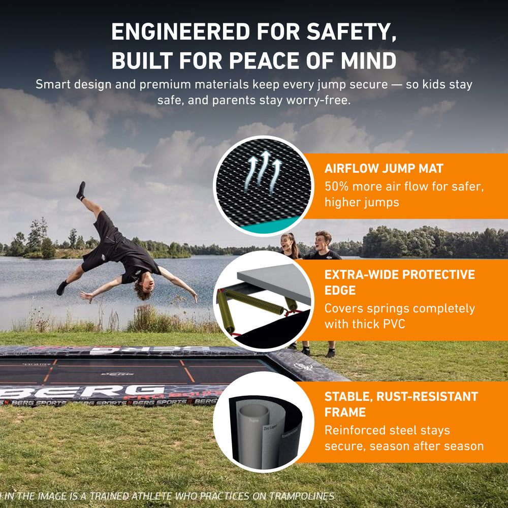 - SAFETY FIRST: BERG knows that safety is a priority, that’s why this trampoline with enclosure is made with the highest quality materials. Long lasting TwinSpring Gold Springs, Airflow Jump Mat, and an included safety net enclosure will not only allow for years of fun, but overall safety while using the Champion trampoline