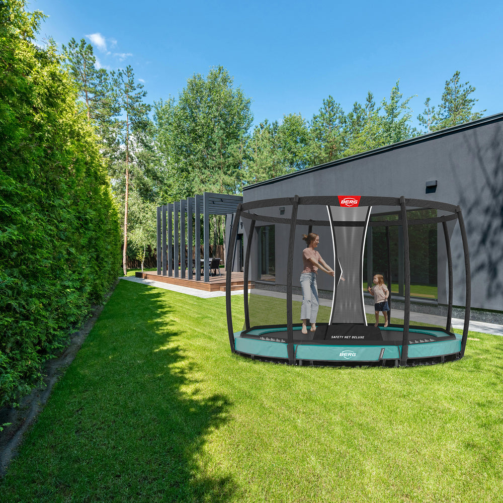 The Champion comes with the unique AirFlow jumping mat and the TwinSpring Gold springs. This makes for better and higher jumps. Because the trampoline is sunk into the ground, it is easy to step onto and it is also nicely concealed in your garden.