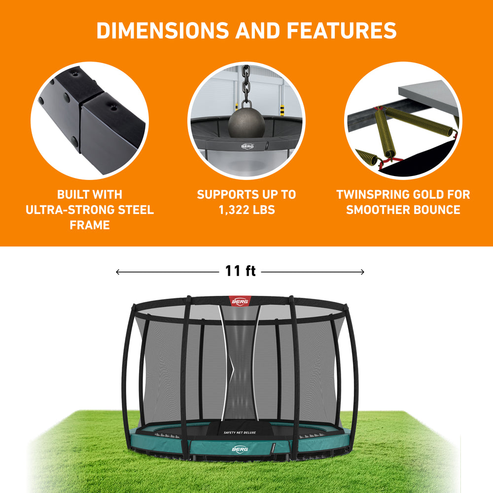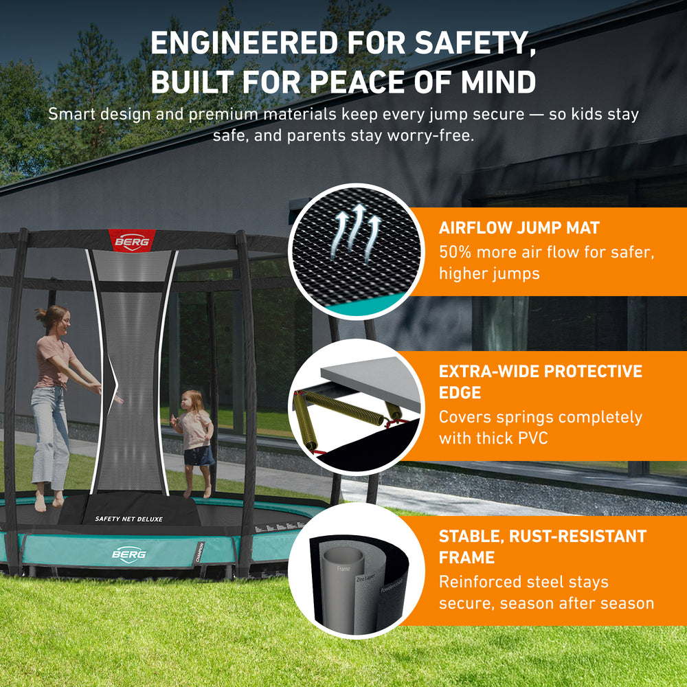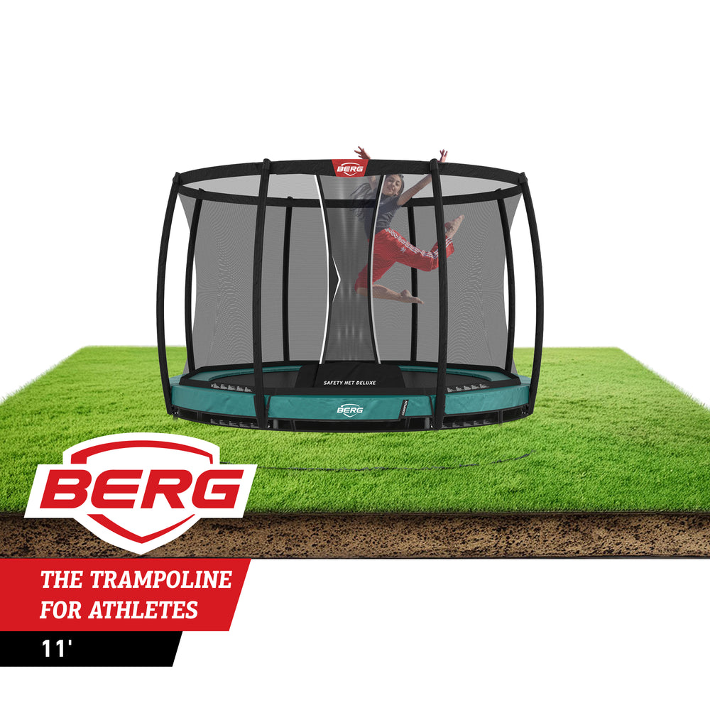 - SAFETY FIRST: BERG knows that safety is a priority, that’s why this trampoline with enclosure is made with the highest quality materials. Long lasting TwinSpring Gold Springs, Airflow Jump Mat, and an included safety net enclosure will not only allow for years of fun, but overall safety while using the Champion trampoline