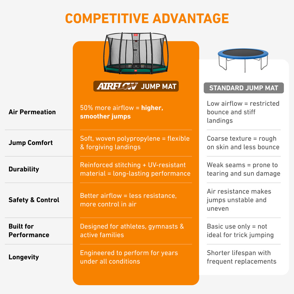 - AIRFLOW JUMP MAT: The Airflow Jumping Mat allows for 50% more air permeation compared with a standard jumping mat. Good airflow ensures less resistance while jumping, which is why you can make higher jumps!