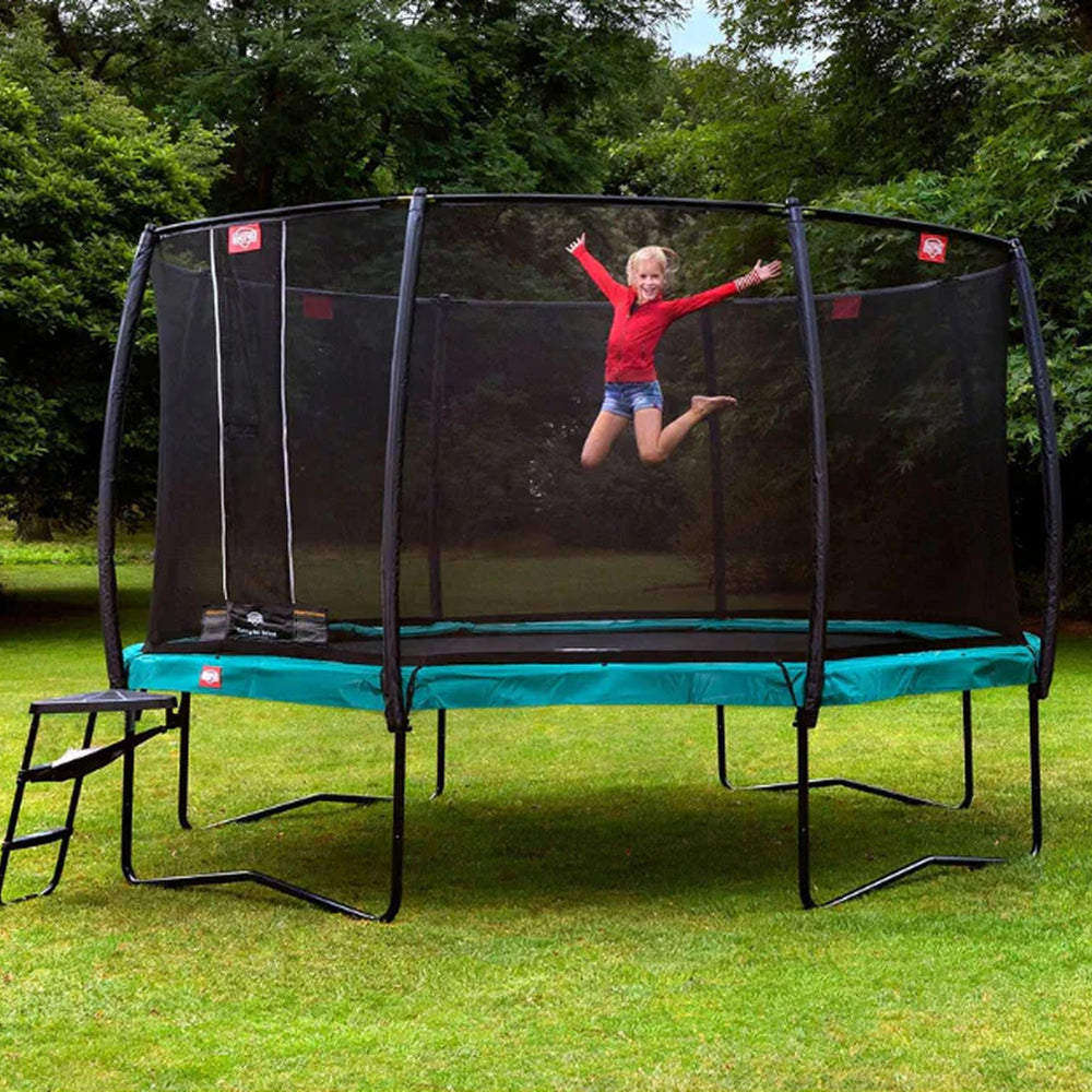 - SAFETY FIRST: BERG knows that safety is a priority, that’s why this trampoline with enclosure is made with the highest quality materials. Long lasting TwinSpring Gold Springs, Airflow Jump Mat, and an included safety net enclosure will not only allow for years of fun, but overall safety while using the Champion trampoline