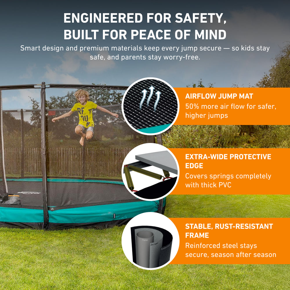 The Grand Champion comes with the unique AirFlow jumping mat and the TwinSpring Gold springs. This makes for better and higher jumps. Because the trampoline is sunk into the ground, it is easy to step onto and it is also nicely concealed in your garden.