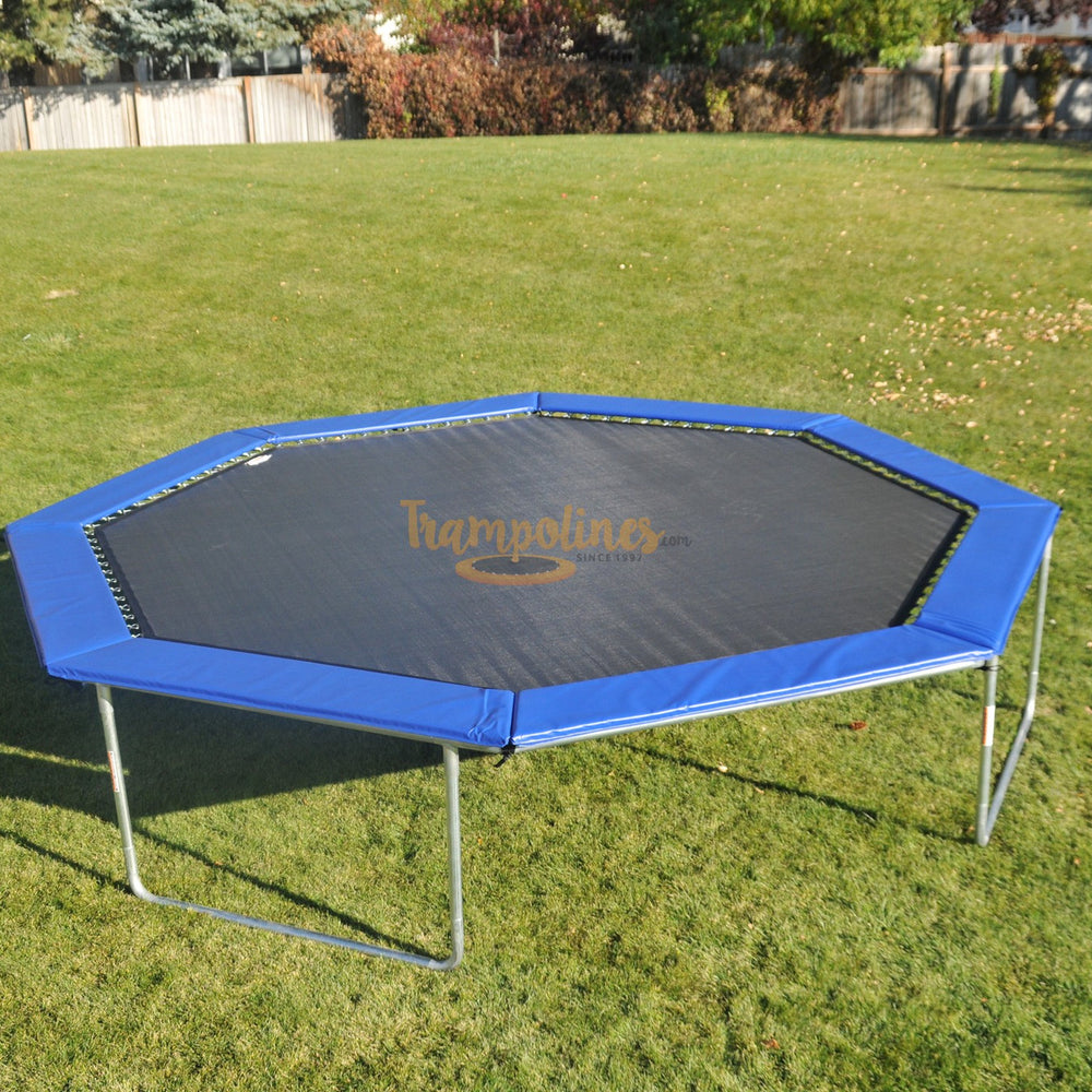 When deciding on the size for an octagonal trampoline, it’s important to know that the size and diameter is measured from the outer frame at a corner of the trampoline to the center. We carry 14ft, 15ft, and 16ft octagon trampolines. It's also important to know the frame size of octagonal trampolines in the event that you need to get replacement mats, pads, safety enclosures, or springs.