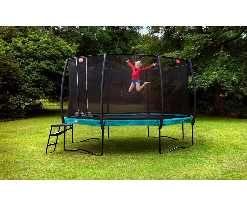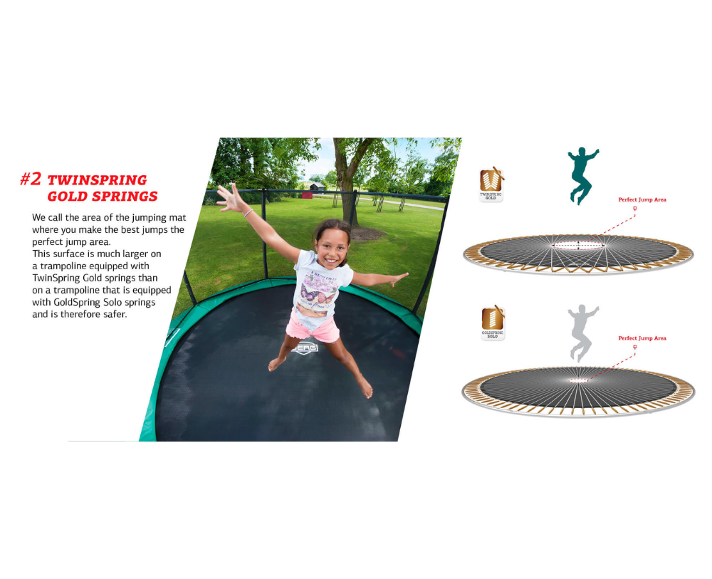 - SAFETY FIRST: BERG knows that safety is a priority, that’s why this trampoline with enclosure is made with the highest quality materials. Long lasting TwinSpring Gold Springs, Airflow Jump Mat, and an included safety net enclosure will not only allow for years of fun, but overall safety while using the Champion trampoline