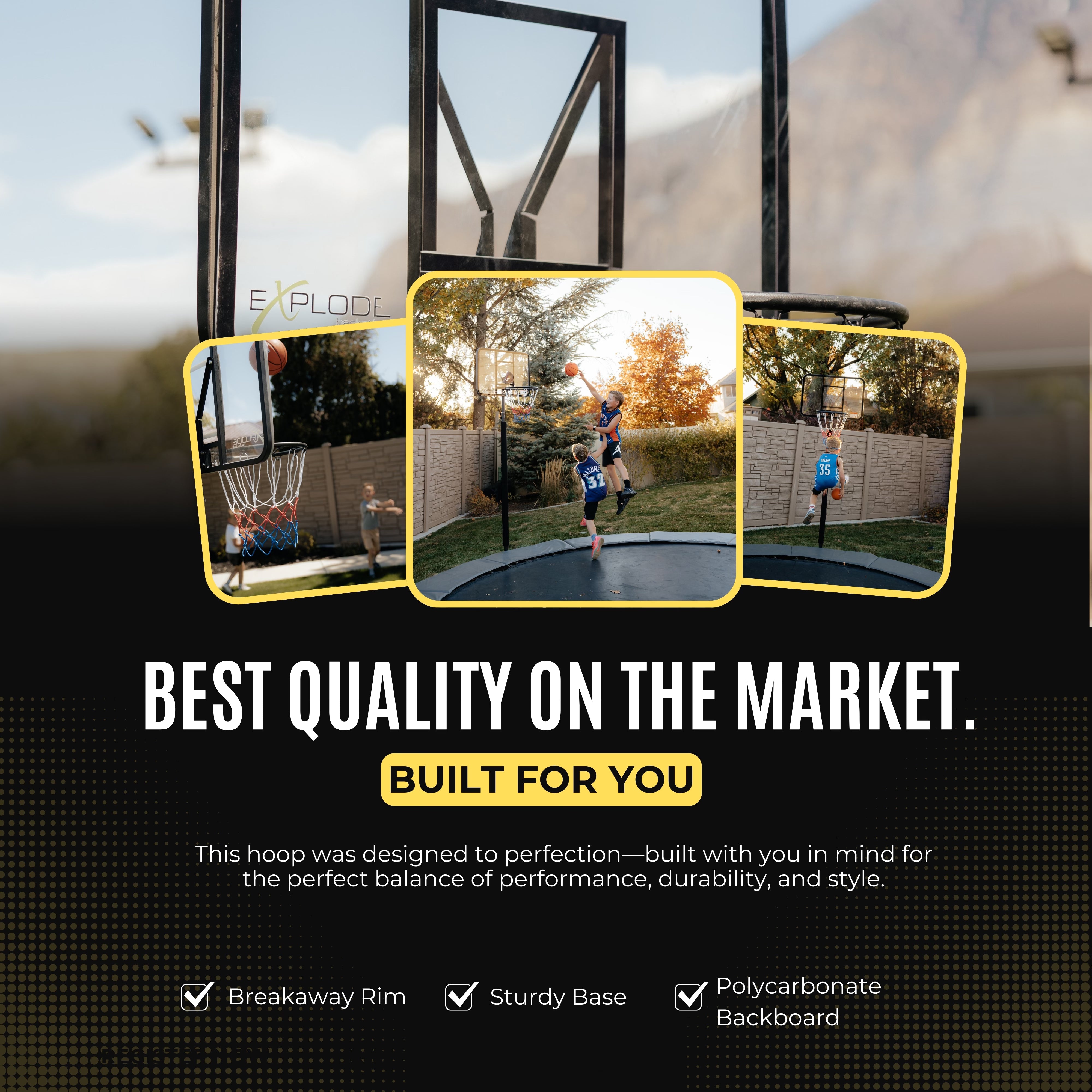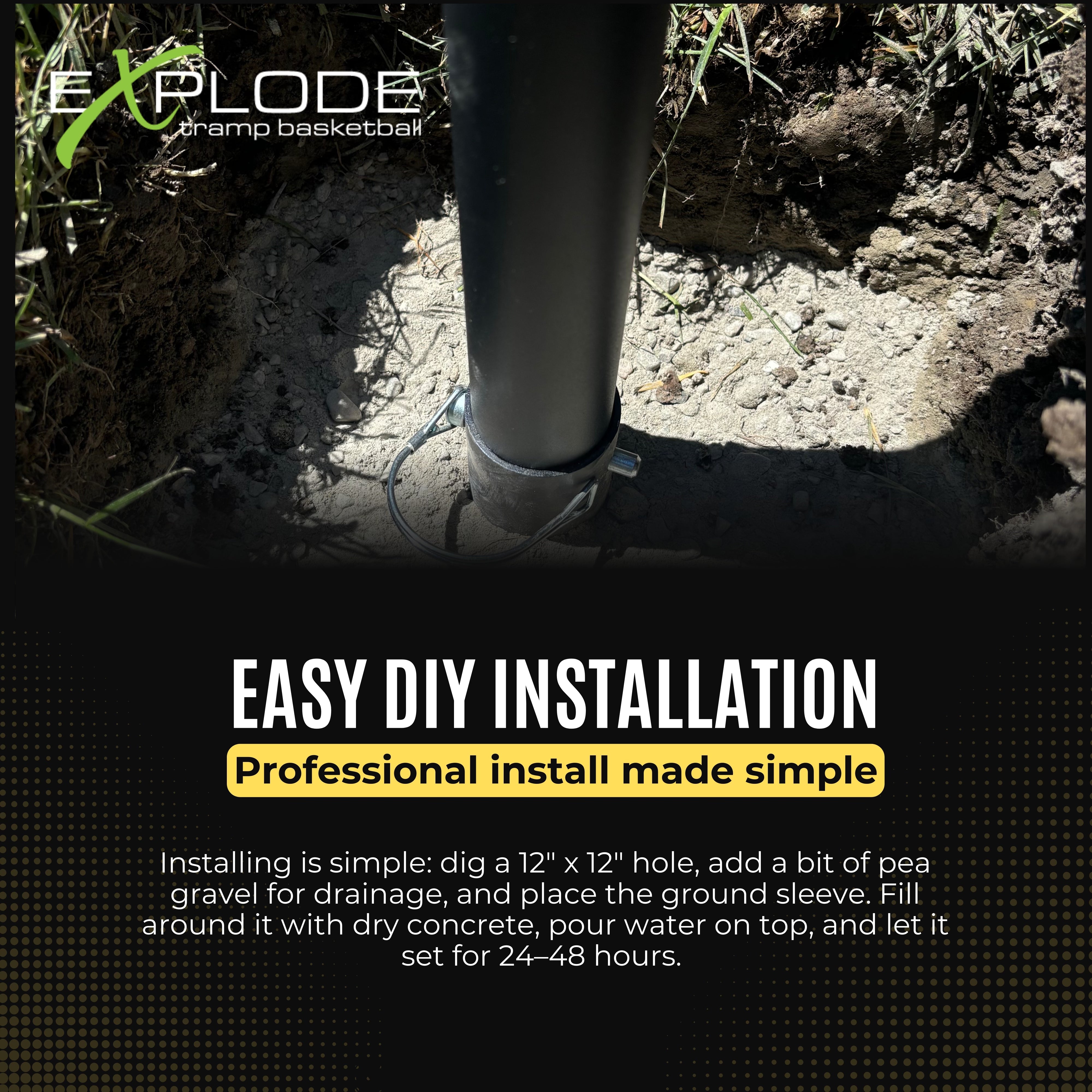Designed for durability and easy installation. The EXPLODE basketball hoop comes with a detachable ground sleeve that securely anchors into the ground with a small bag of concrete. This sturdy setup ensures long-lasting stability, while the hoop itself can be easily detached from the sleeve for convenient storage or transport. Perfect for a reliable, hassle-free setup that stands up to dunking and heavy play!