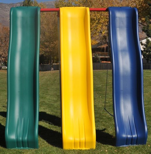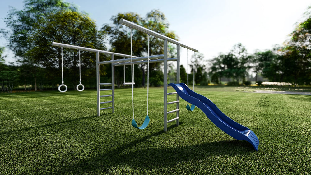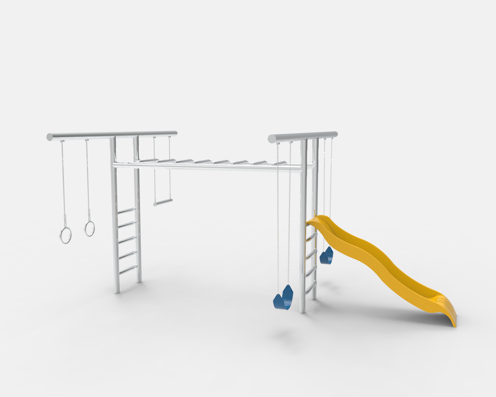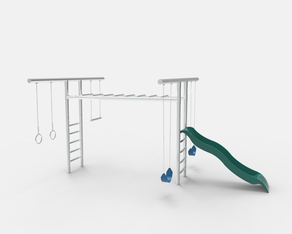 Our all-time best selling playground! The Monkey Bar T-Swing provides a large variety of play stations for your children. This model includes a 2-belt swings, trapeze bar, rings, adjustable monkey bars, and 10' commercial plastic slide. When placing your order please provide what accessories you would like in the notes section on checkout. You won't be disappointed with this high quality monkey bar T-Swing playground.