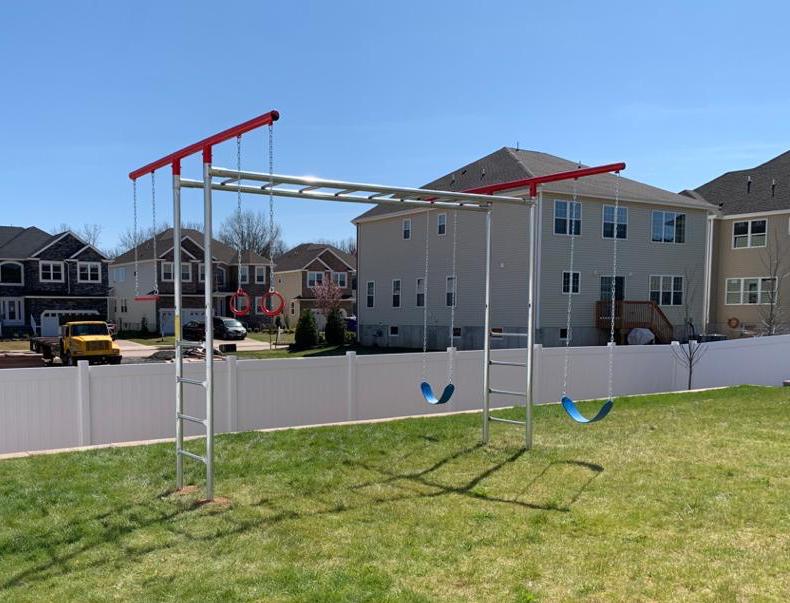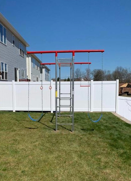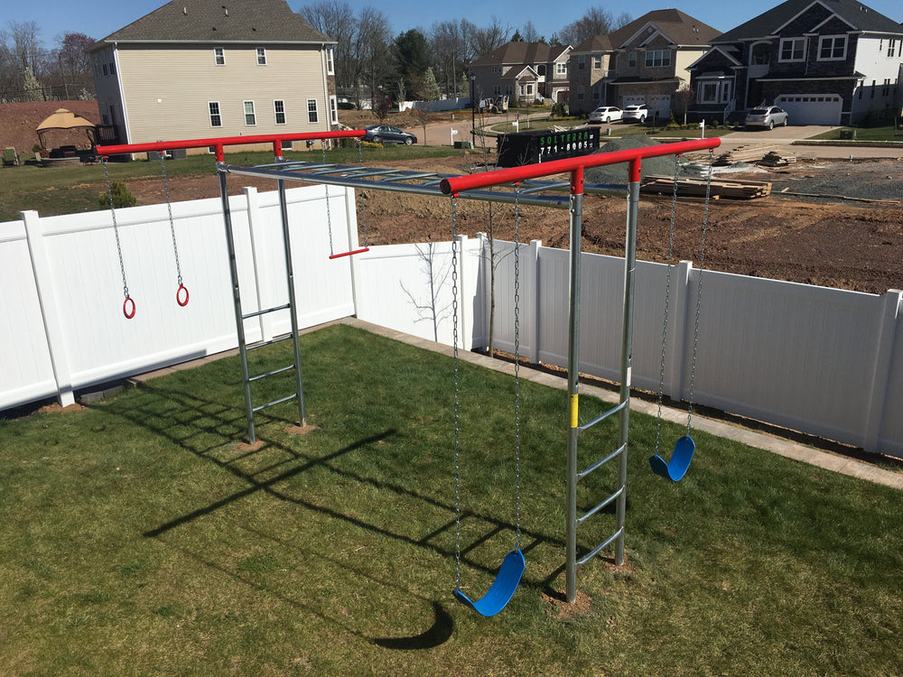 Notice: Swing sets previously powder-coated, will no longer have the red powder coating. All swing set top bars will be galvanized steel.
